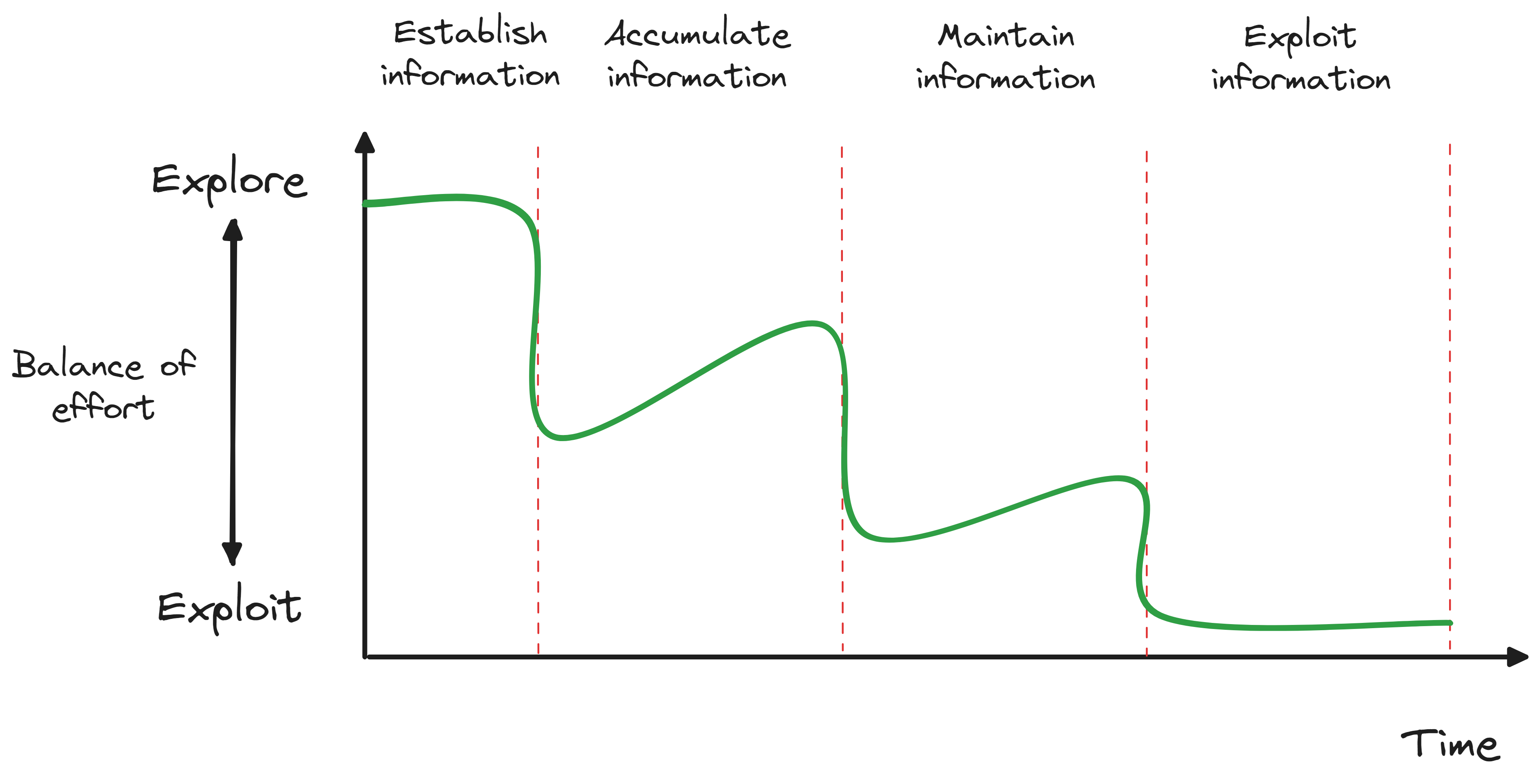 Balancing exploration and exploitation over time follows a predictable pattern1. In the embryonic stages of a new business, product or market opportunity, you know very little. The focus is therefore entirely on exploration. Establishing a basic level of understanding which can then be exploited.